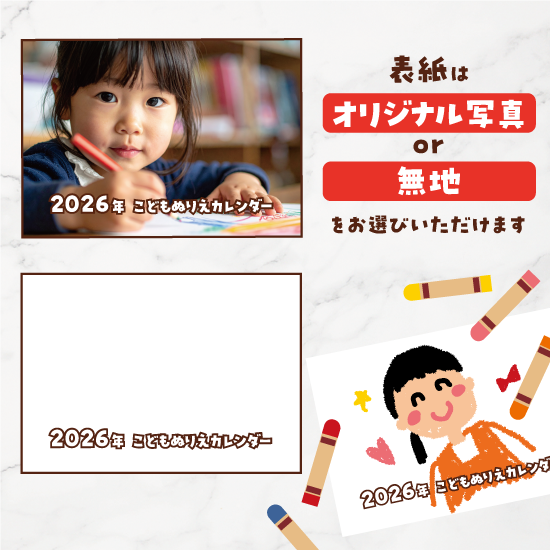 表紙は、お気に入りの写真やイラストを入稿して頂く「オリジナル写真」と、自由にお絵描きできる「無地」タイプの2種類から選択可能。世界にひとつだけの特別な1冊を作れます。